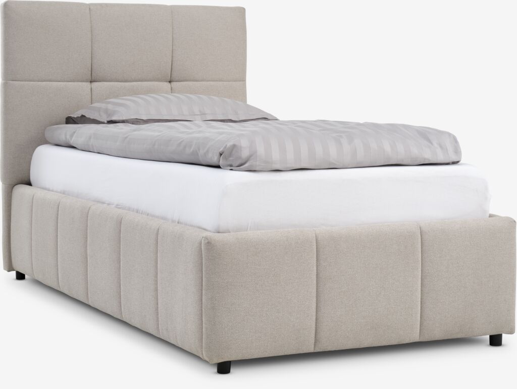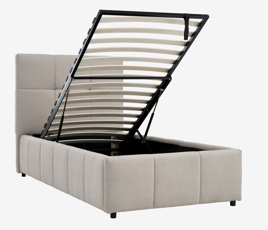 Fabric. With storage space and bed base with hydraulic lift. Fits spring and foam mattresses 90x190 cm. Incl. slatted base. Excl. mattress. Single W110 x L207 x H115 cm
