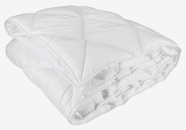 Quality duvet with an airy, insulating filling of siliconised, spiral-shaped hollow-fibre, 1750g. Soft 100% polyester micro-fibre casing. Tog 10.5. Wash 60°C. King 240x220 cm