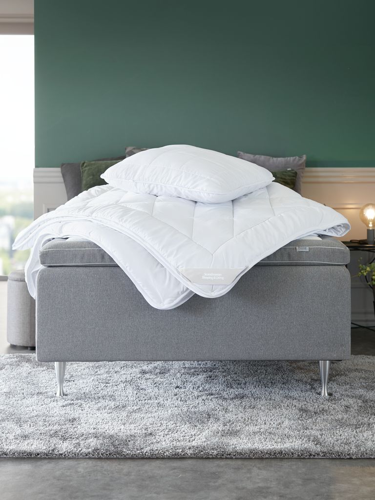 Practical four seasons duvet 200x220 cm consisting of 2 duvets fixed together with buttons. The 2 duvets can be used together and separately depending on the season. Soft, light filling of siliconised hollow-fibre, 1000/1400 g. Soft 100% polyester microfibre casing. Wash 60°C. Double 200x220 cm