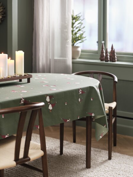 Coated tablecloth with Christmas elves on a dark green background. The acrylic coating makes it easy to wipe clean, while a practical non-slip backing ensures it stays securely in place on the table. 140 cm