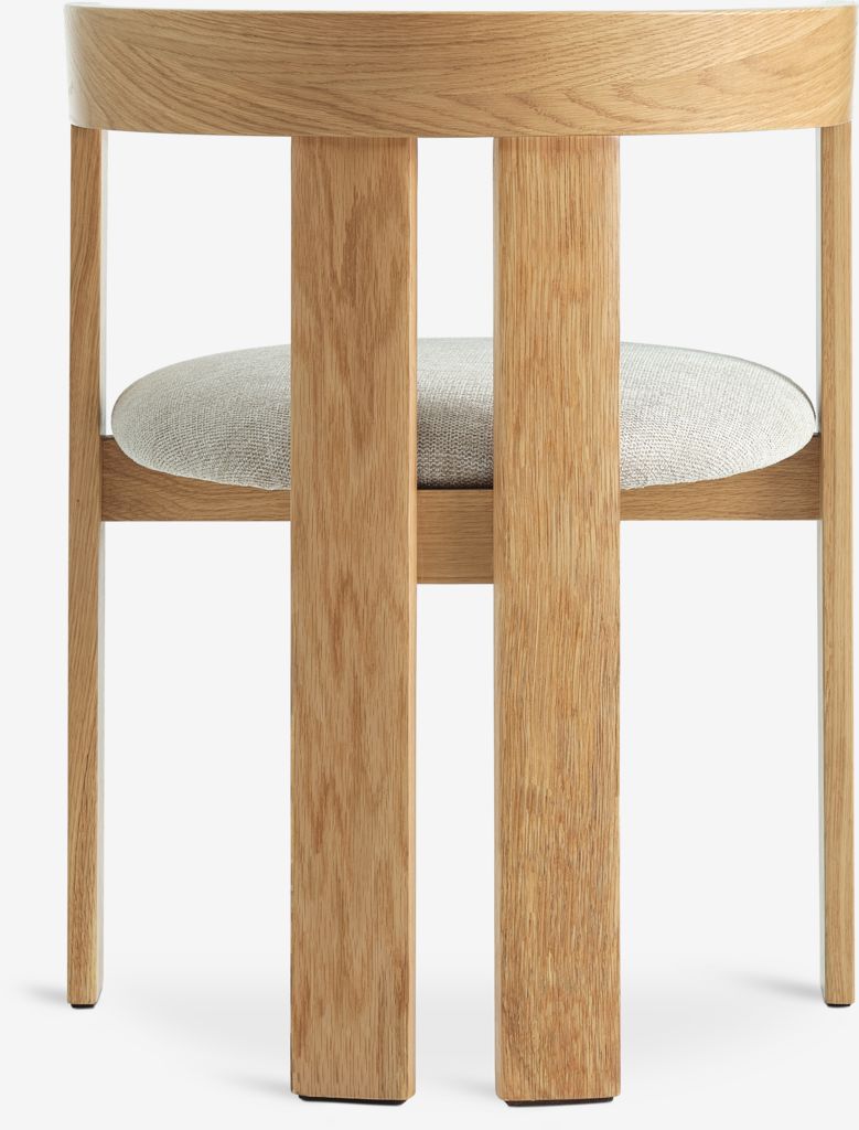 Dining chair with armrests that provide added support and comfort. The chair has a padded seat in beige fabric. Sturdy frame in solid oak with a curved backrest.