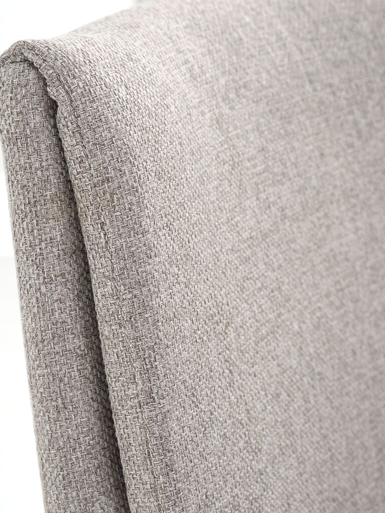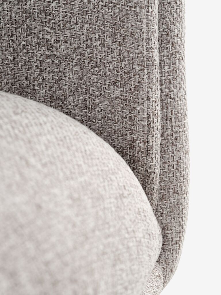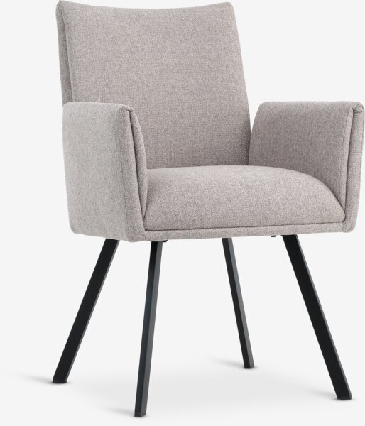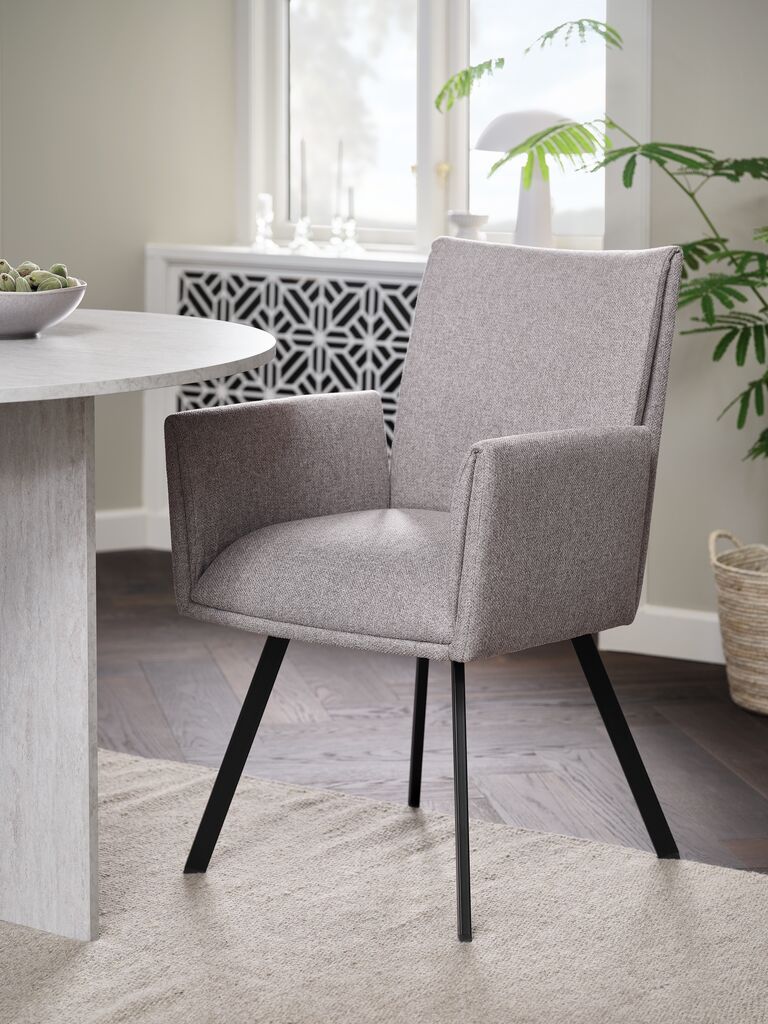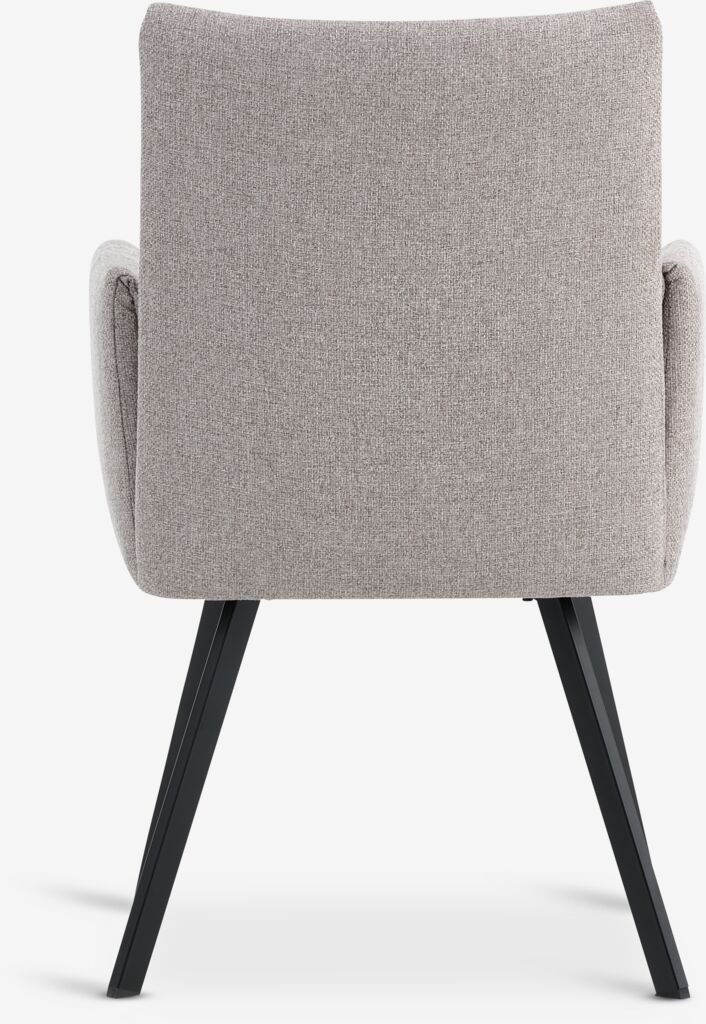 Dining chair with armrests that provide added support and comfort. The chair has a padded seat with pocket springs and a backrest in beige fabric. Black legs in steel.