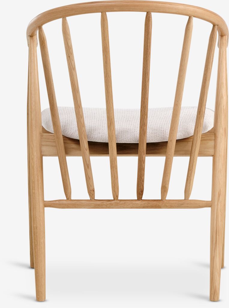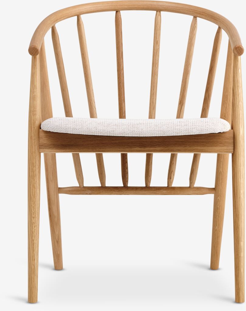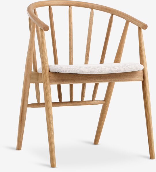 Dining chair with armrests that provide added support and comfort. The chair has a padded seat in off-white fabric. Frame in solid oak with a curved backrest.