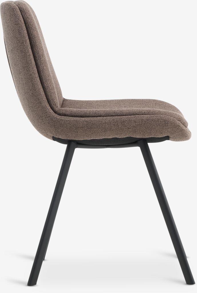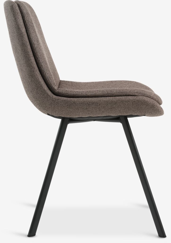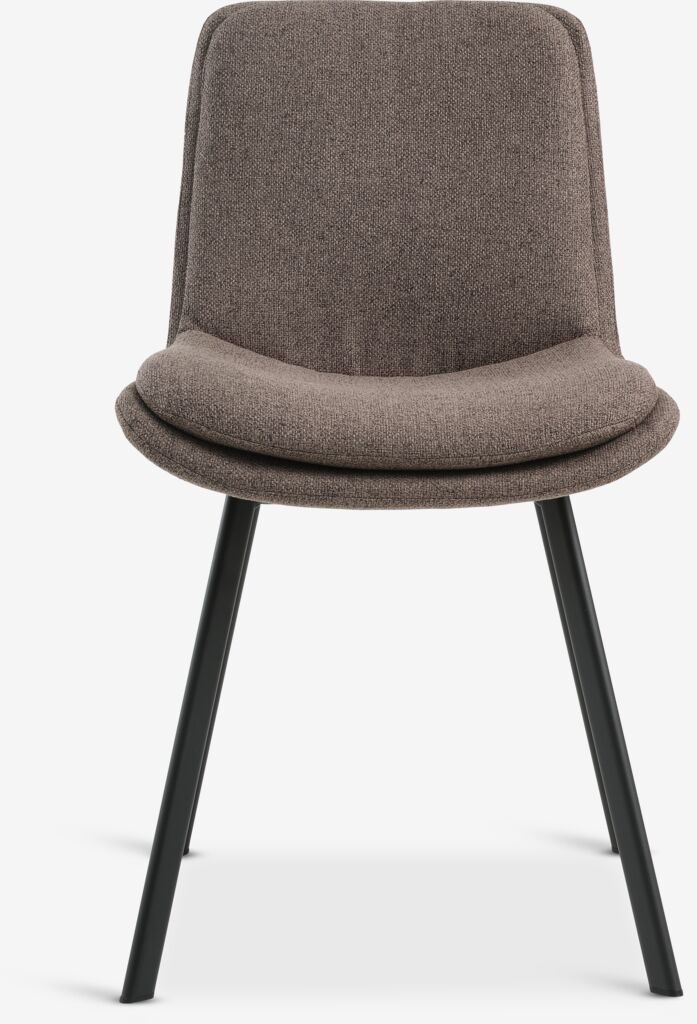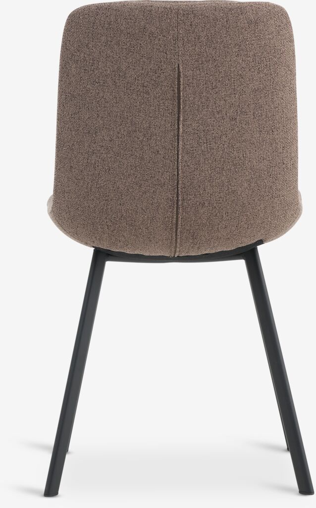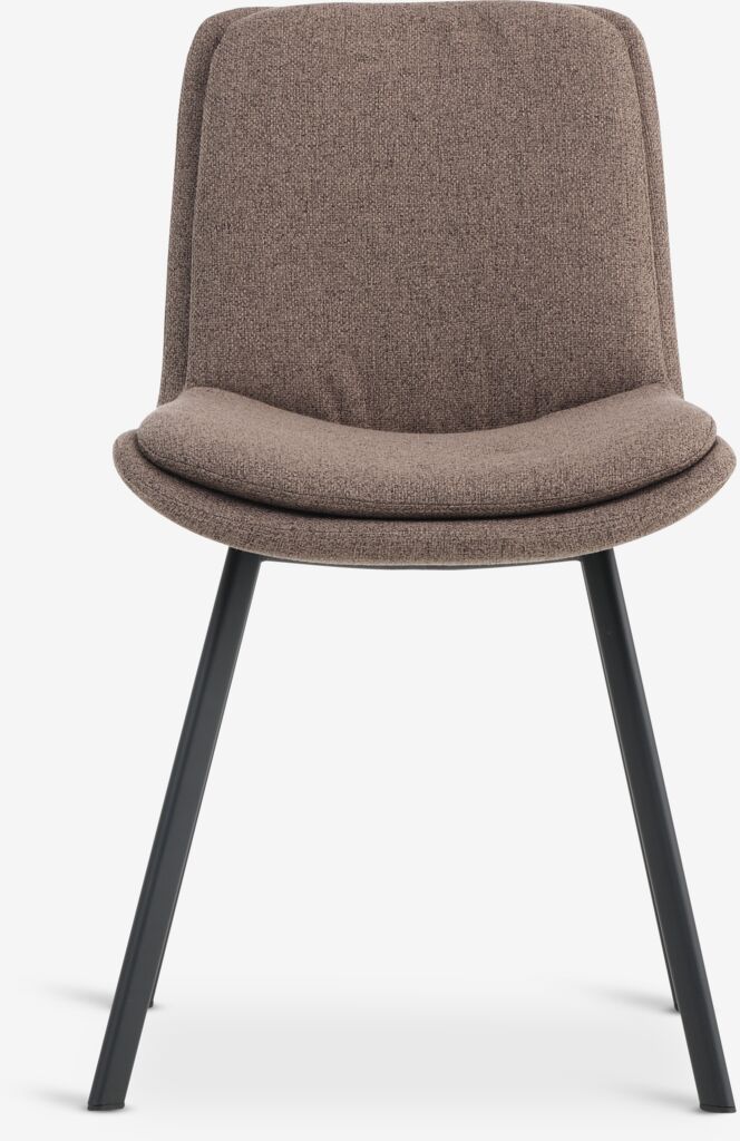Dining chair with padded seat and backrest in light brown fabric. Black legs in steel.