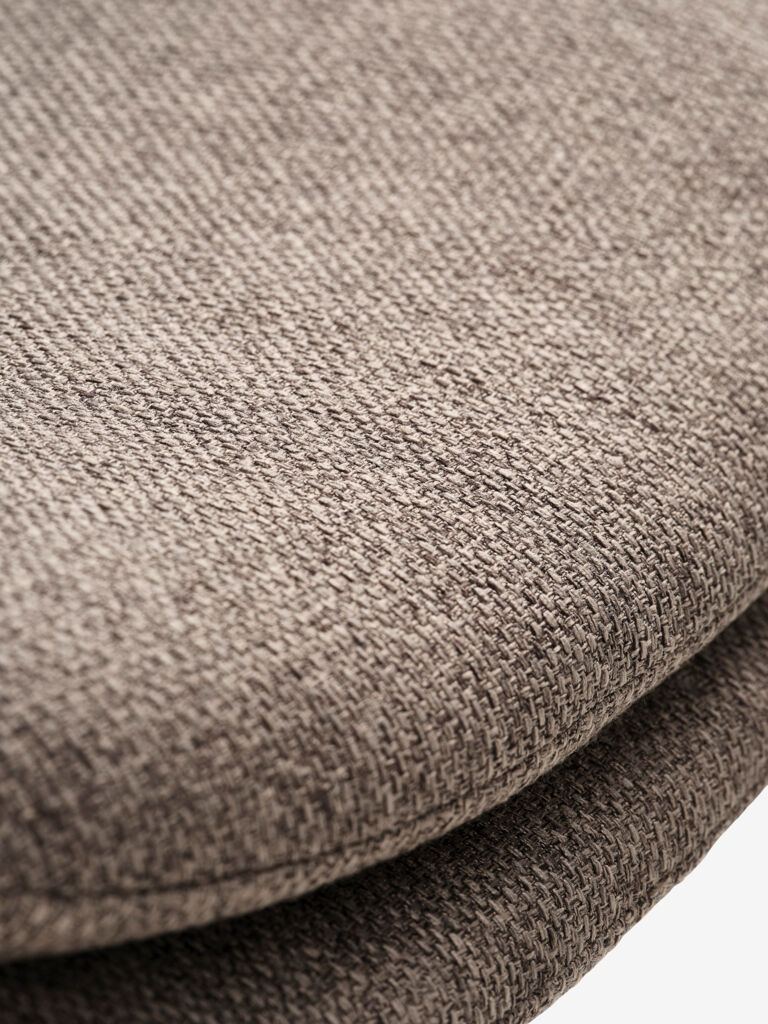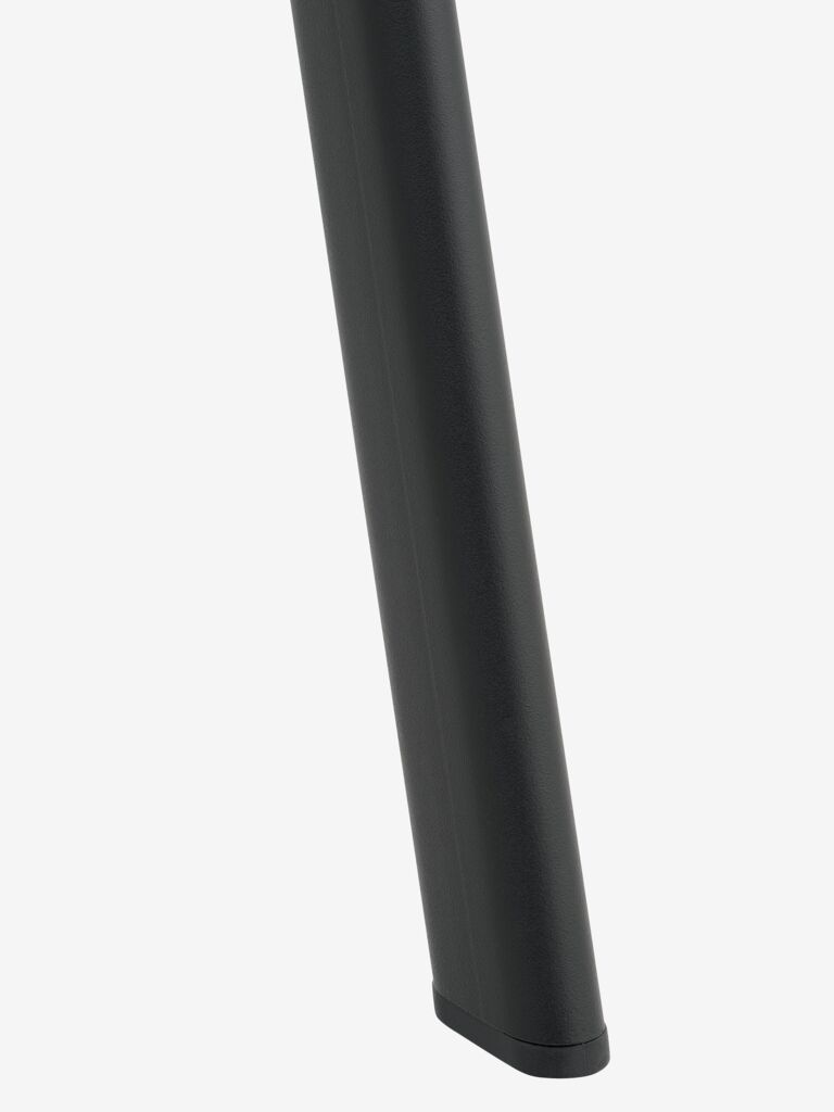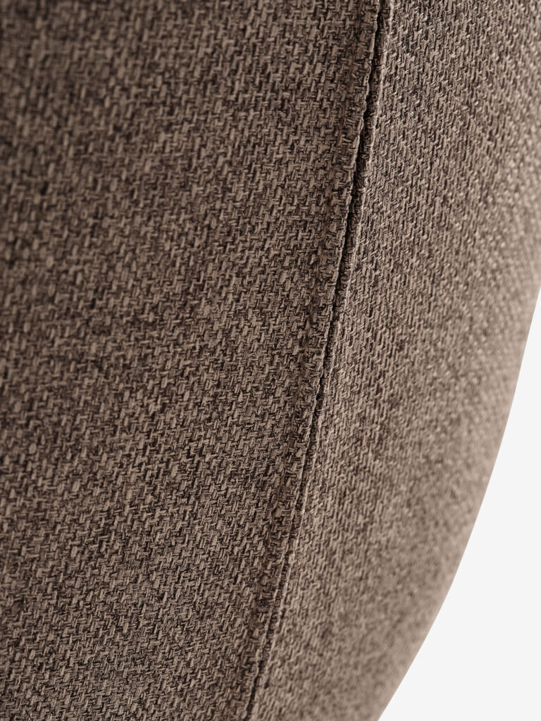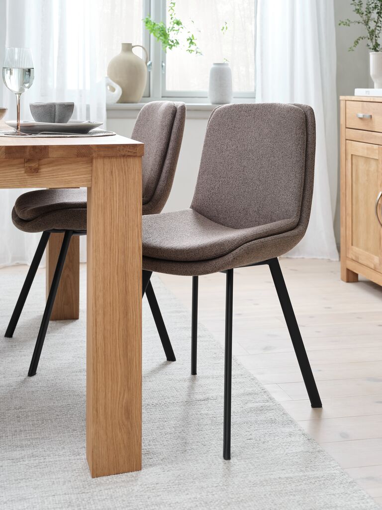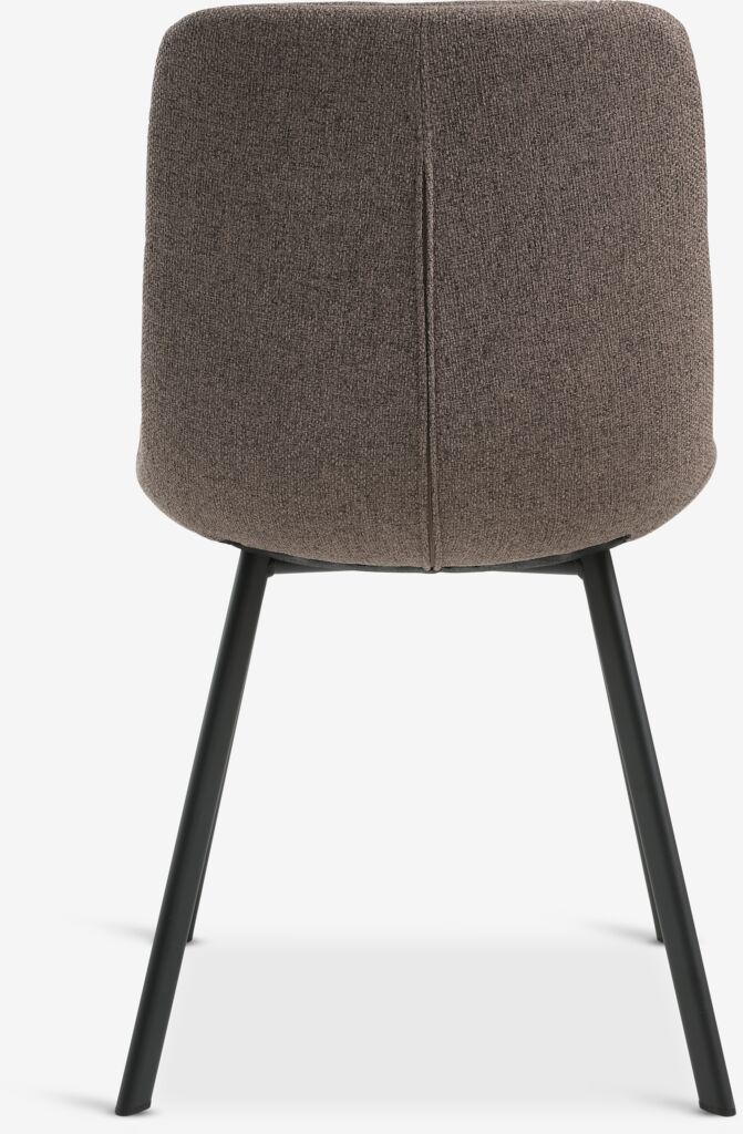 Dining chair with padded seat and backrest in light brown fabric. Black legs in steel.