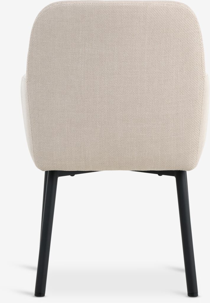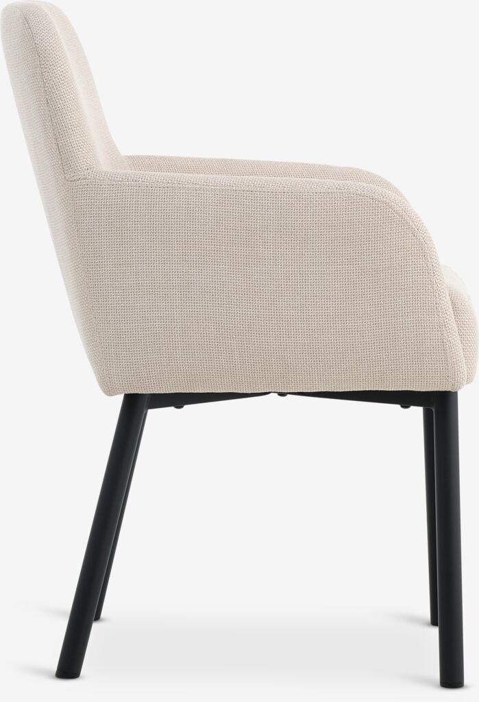 Dining chair with armrests that provide added support and comfort. The chair has a padded seat with pocket springs and a backrest in beige fabric. Black legs in steel.