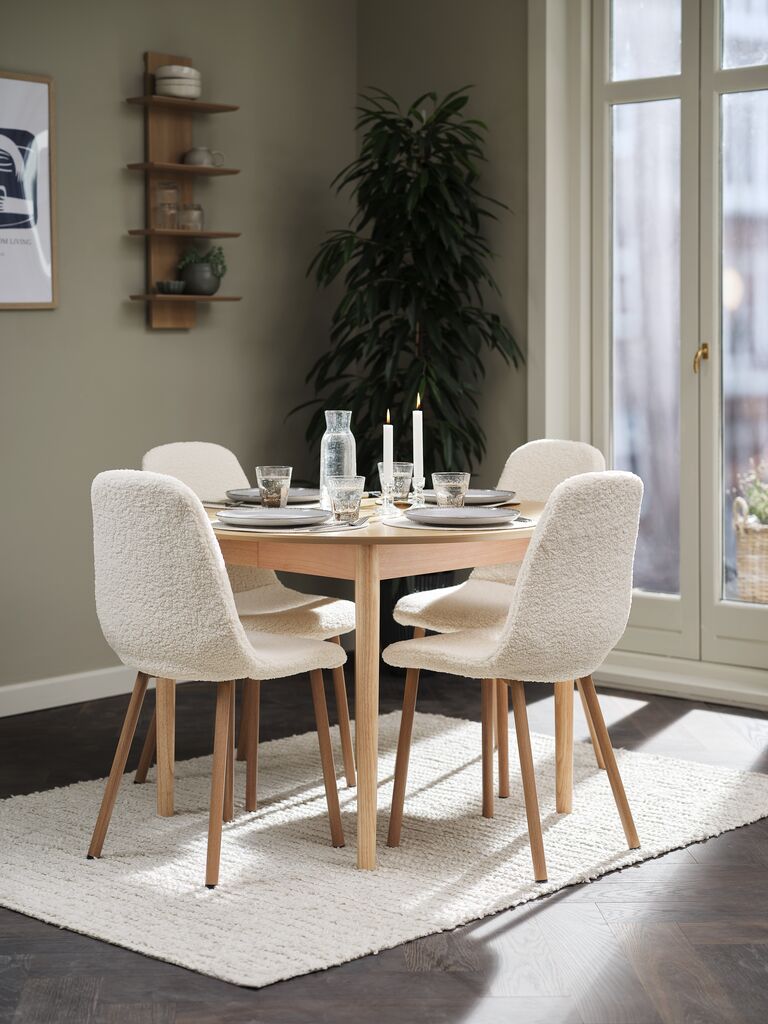 Table: Solid wood and oak veneer. D110 x H75 cm. Incl. 2 leaves. Size when extended W110 x L200 x H75 cm. Chair: Fabric and steel. Seat in classic furniture fabric with a detachable cover in teddy fabric.