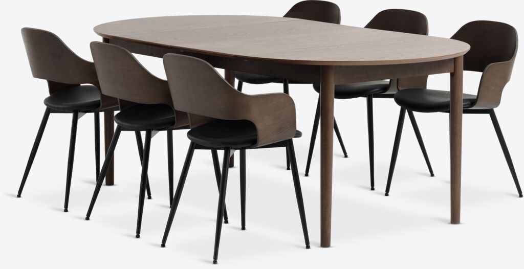 Table: Solid wood and oak veneer. D110 x H75 cm. Incl. 2 leaves. Size when extended W110 x L200 x H75 cm. Chair: Faux leather, oak veneer and steel.