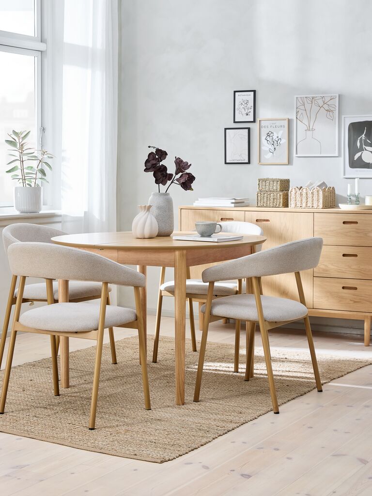 Table: Solid wood and oak veneer. D110 x H75 cm. Incl. 2 leaves. Size when extended W110 x L200 x H75 cm. Chair: Fabric and steel.