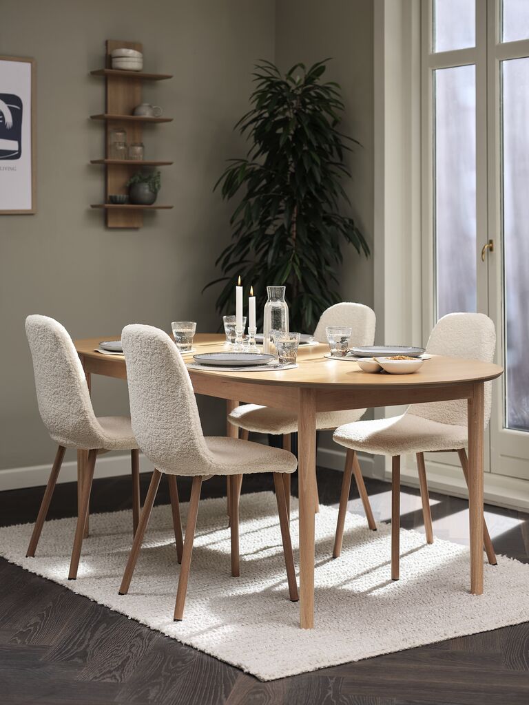 Table: Solid wood and oak veneer. Incl. 2 leaves, which can be stored under table top. W100 x L200/240/280 x H75 cm. Chair: Fabric and steel. Seat in classic furniture fabric with a detachable cover in teddy fabric.