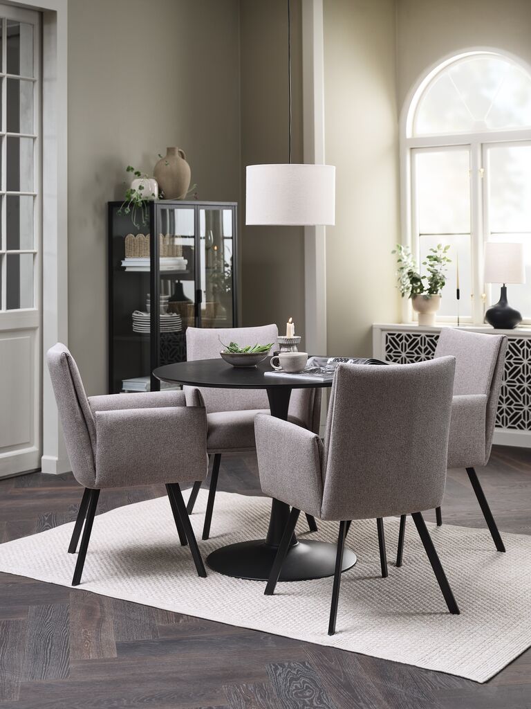 Table: Ash veneer and steel. D100 x H75 cm. Chair: Fabric and steel. Seat cushion with pocket springs and foam padding.