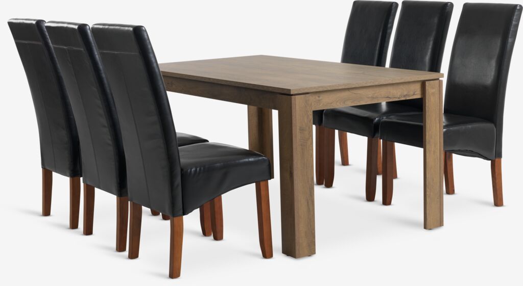 Table: Deco veneer. W90 x L160 x H76 cm. Chair: Faux leather and solid pine.