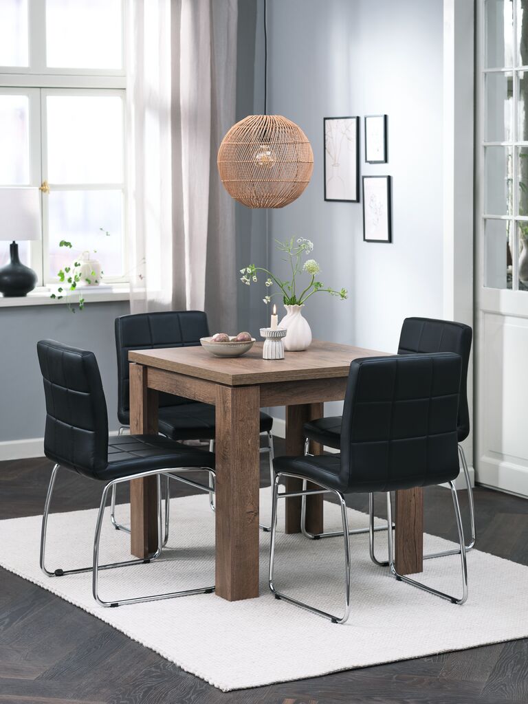 Table: Deco veneer. The flip-top allows you to easily double your table top size. W80 x L80/160 x H76 cm. Chair: Faux leather and chrome.