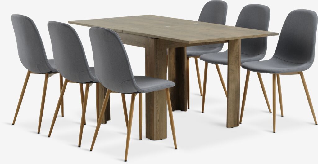 Table: Deco veneer. The flip-top allows you to easily double your table top size. W80 x L80/160 x H76 cm. Chair: Fabric and steel.