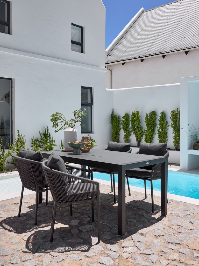 4-seater garden furniture set. Table: Aluminium and DURAWOOD® composite wood. DURAWOOD® is a durable composite material consisting of FSC® hardwood fibre and plastic. W92 x L160 x H74 cm. Chair: Aluminium and polyester. Incl. luxury cushions with quick-drying, structure-woven cover. Stackable.