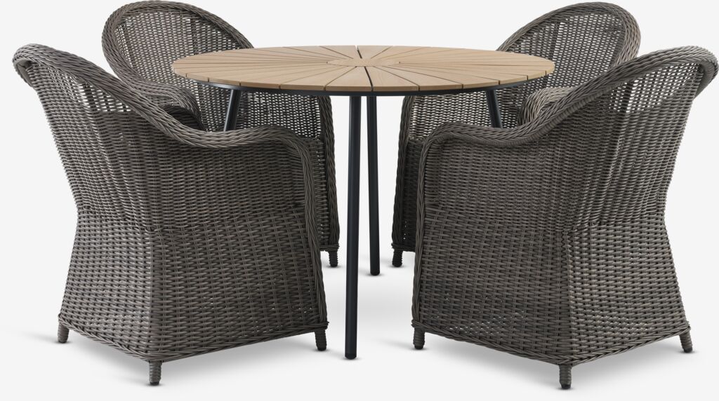 4-seater garden furniture set. Table: Aluminium and artificial wood. D110 x H74 cm. Chair: Aluminium and polyrattan.