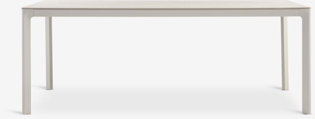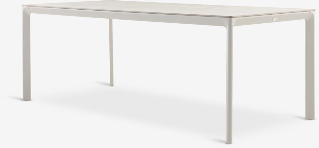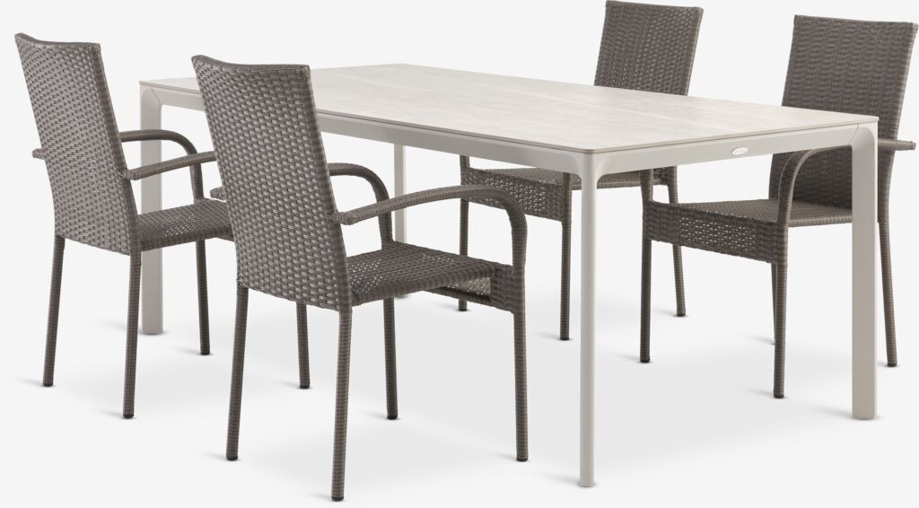 4-seater garden furniture set. Table: Aluminium and sintered stone. The sintered stone tabletop is resistant to scratches, stains and heat. W95 x L200 x H74 cm. Chair: Steel and polyrattan. Stackable.