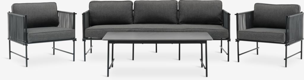 Bring relaxation and modern aesthetic to your outdoor space with STOVNER lounge set. This grey 5-seater set consists of a sofa and 2 chairs with comfortable cushions and a matching lounge table with a polystone tabletop.