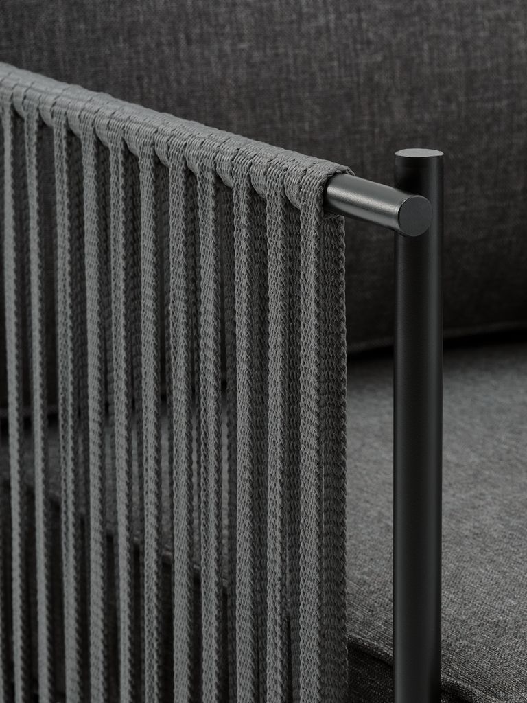 Durable polyamide rope is woven around the backrest and armrest of the lounge sofa and chair. This adds an elegant touch to the lounge furniture while allowing airflow. Polyamide rope is resistant to moisture and has good strength and elasticity.