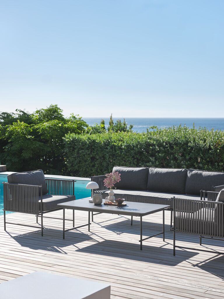 The lounge table has a tabletop made of polystone. It is a durable composite material with a natural stone look. It is typically made from a mix of stone powder and resin, which forms a strong material that is lighter than solid stone. Polystone is weather-resistant, which means it can withstand exposure to sun, moisture and temperature change.