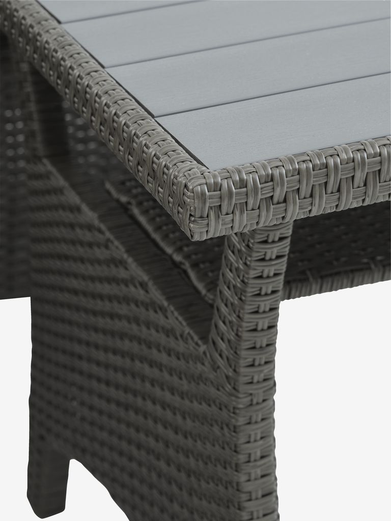 The lounge table has a tabletop made of artificial wood. It has the appearance and texture of natural wood without the need for maintenance. It is made from plastic, such as polystyrene, which forms a durable material. Artificial wood is weather resistant, which means it can withstand exposure to sun, moisture and temperature change. Avoid placing glass items in direct sunlight on the artificial wood, as this can cause burn marks and discolouration.