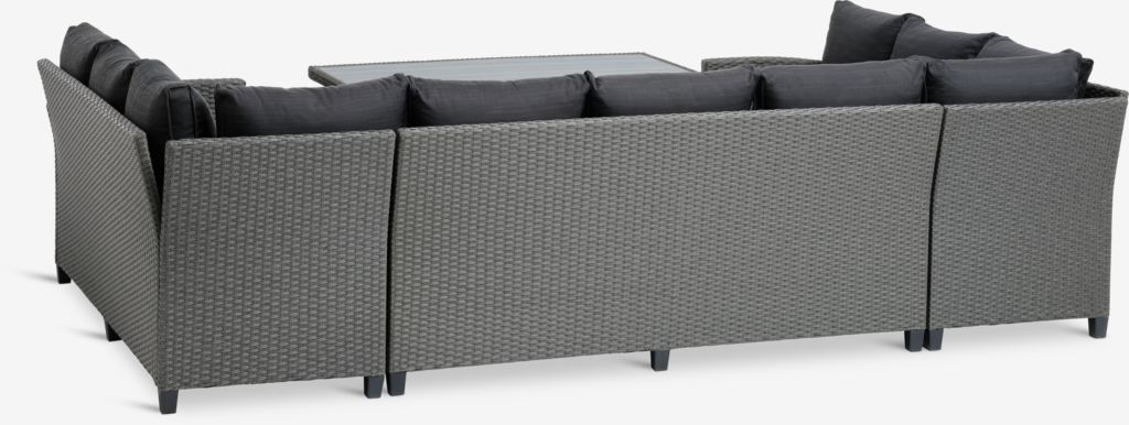 Create a cosy, comfortable outdoor space with the spacious ULLEHUSE lounge set. This grey 9-seater set consists of a U-shaped sofa with comfortable cushions and a matching lounge table with an artificial wood tabletop. The lounge sofa features practical storage underneath the seat.