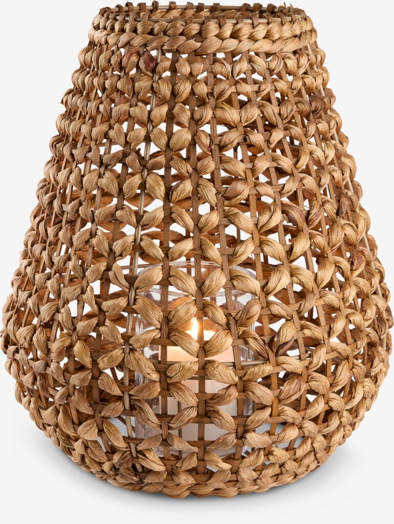 Lantern made of steel and braided water hyacinth in a warm brown shade with a glass container inside. The light will shine through the holes and create a cosy atmosphere. D32 x H38 cm