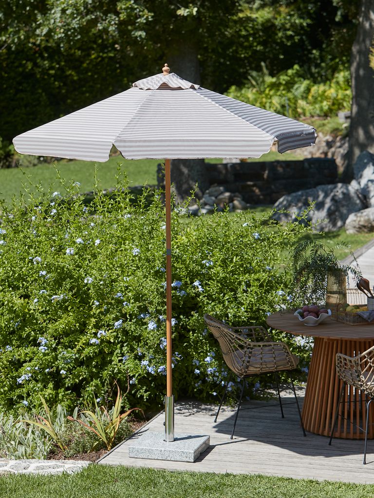 Needed a cost effective but stylish umbrella to insert into the table. Didn’t want a huge one, something more to shade the table rather than overshadow all the chairs as we have a freestanding one. Was dubious as to quality etc but it exceeded expectations and looks much more upmarket than some given the great price. Highly recommend. Had to use a wedge to secure as the pole is quite slim but seems fine.