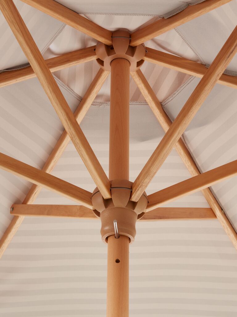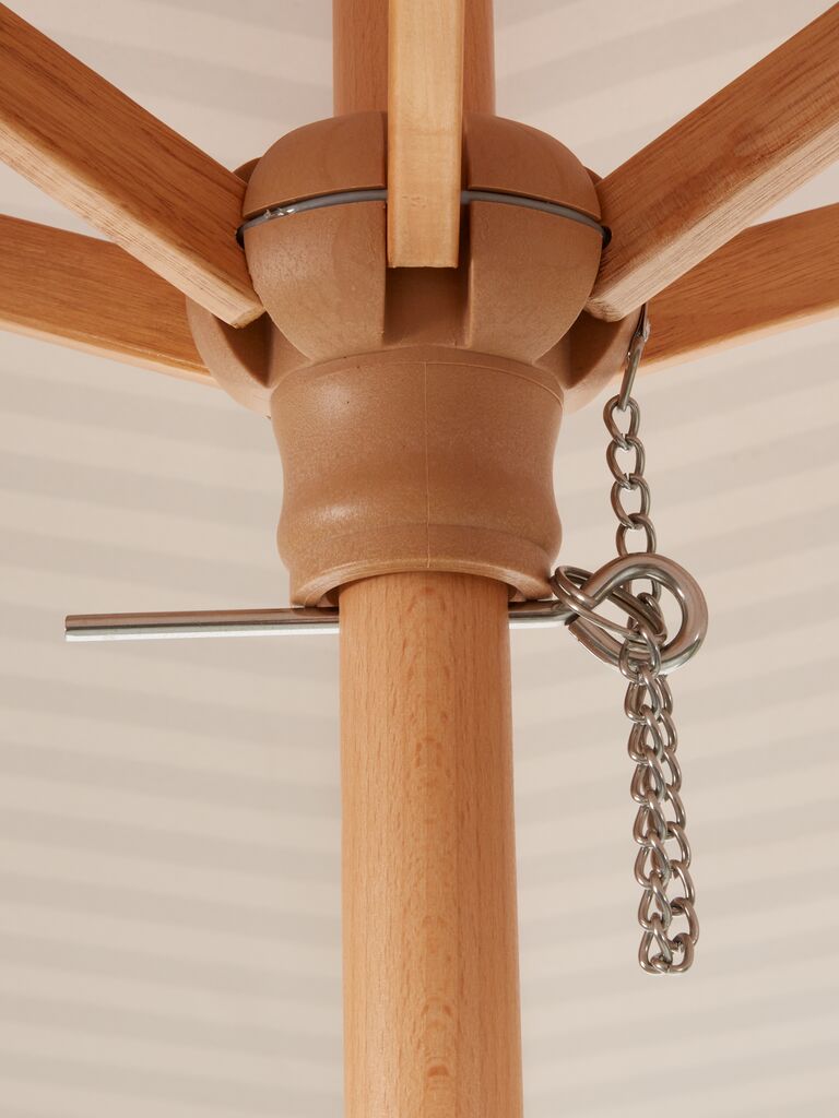 The parasol has a lacquered FSC® hardwood pole, which combines durability with natural beauty. The weight of hardwood adds stability to the parasol. Lacquer provides a protective coating to the wood to shield it from wear and weather.
