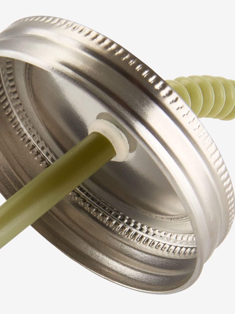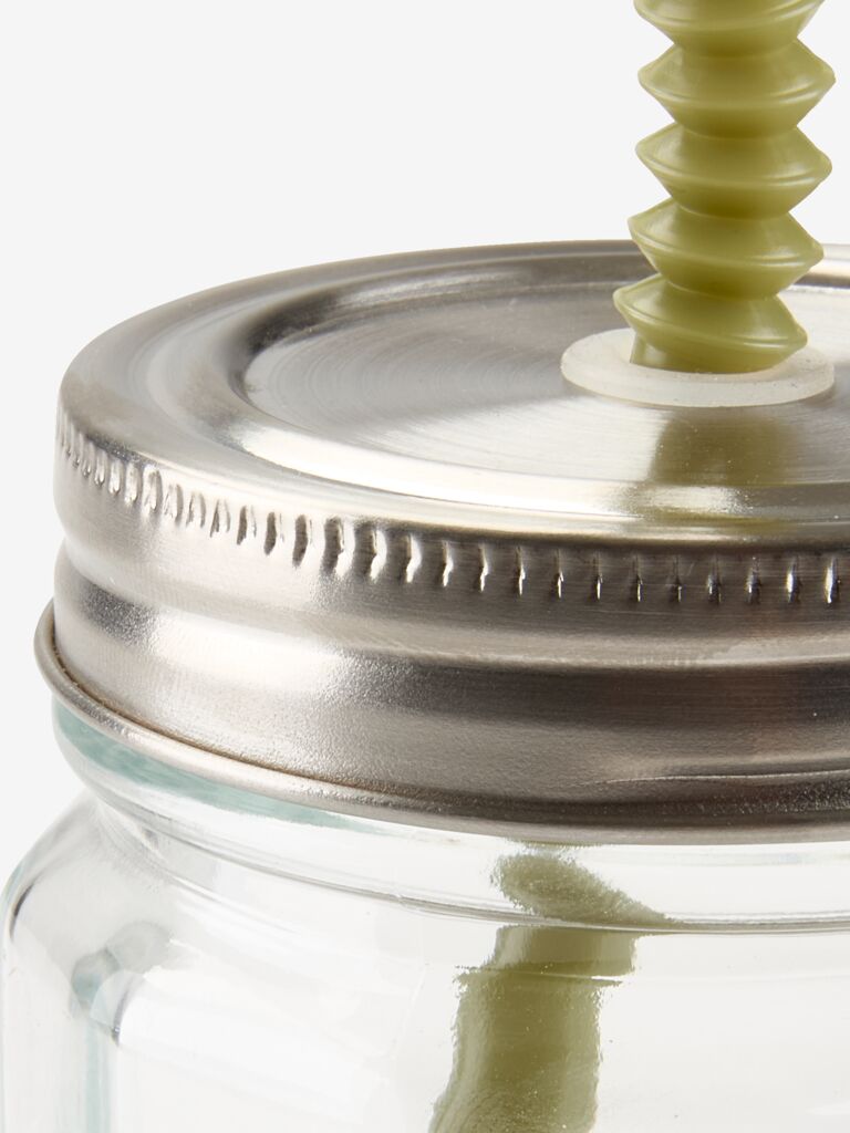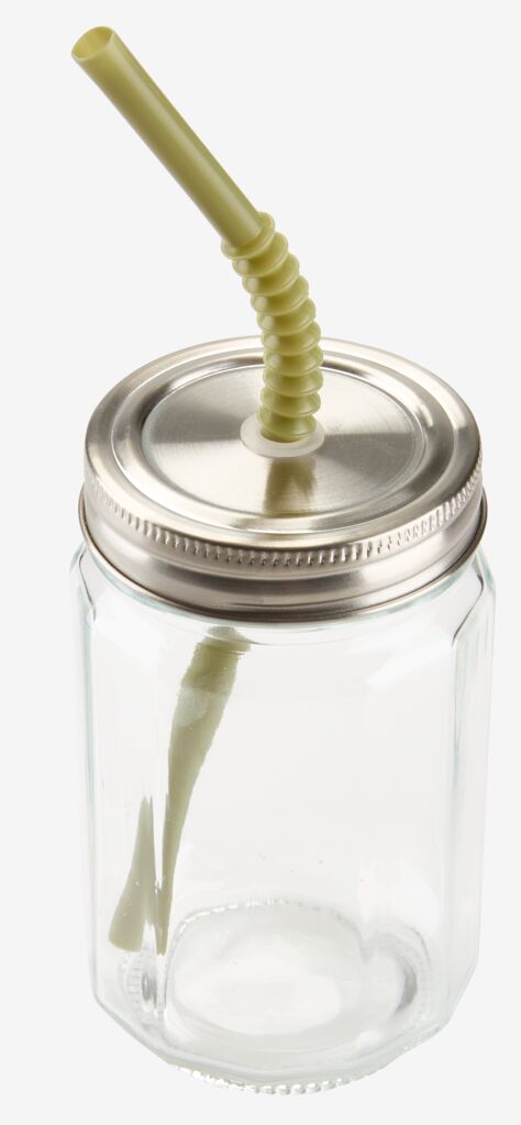 Drinking glass with a practical screw-on lid and a reusable, green straw. The secure lid helps to prevent spills, making it ideal for picnics, camping, or use in the garden. This glass jar offers a capacity of 450 ml. D8 x H13 cm