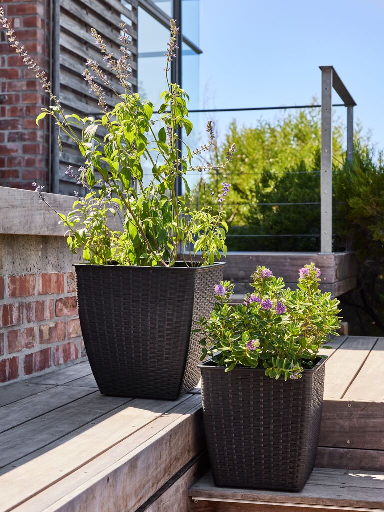 Planter basket with a woven design in durable, black polyrattan. The material is lightweight and frostproof, making the planter suitable for outdoor use. A drainage hole can easily be made. W38 x L38 x H39 cm