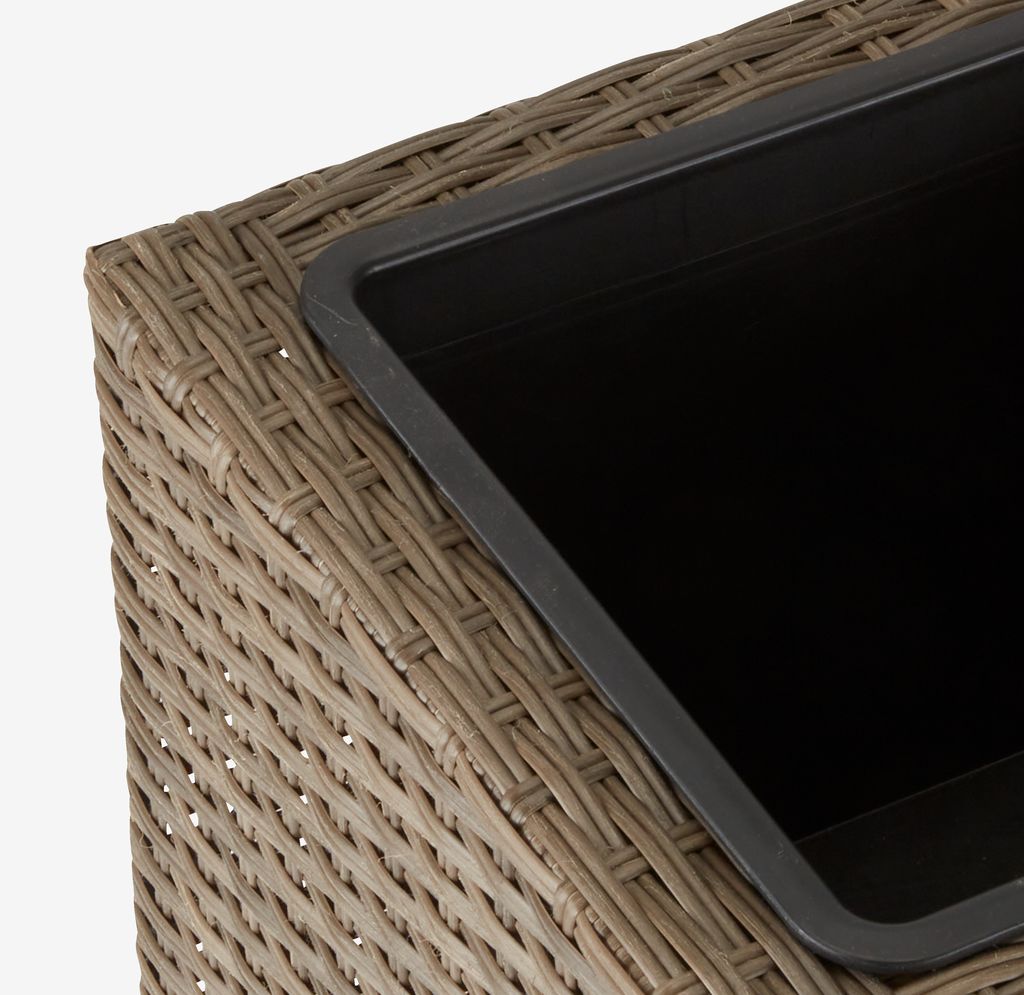 Planter box with a durable, frostproof polyrattan weave and a powder-coated steel frame. Its raised height is comfortable for planting and maintenance. A drainage hole can easily be made in the inner pots. W30 x L83 x H60 cm