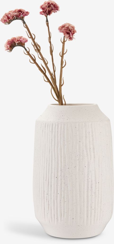 Vase in off-white dolomite with a vertical ribbed texture and speckled finish. The tall shape is ideal for displaying larger bouquets or branches, but also stands beautifully on its own as a decorative piece. D21 x H33 cm