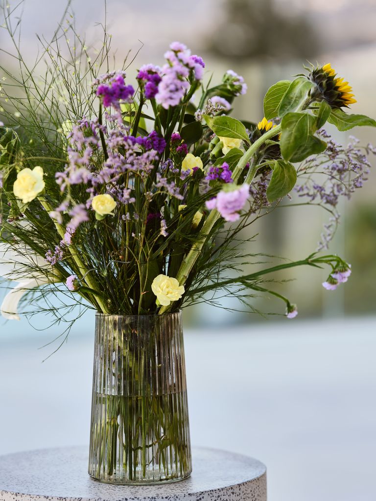 Vase in green glass with a ribbed surface that gives it a modern expression. Its classic shape is suitable for both bouquets and single stems. The vase is also decorative on its own. D13 x H20 cm