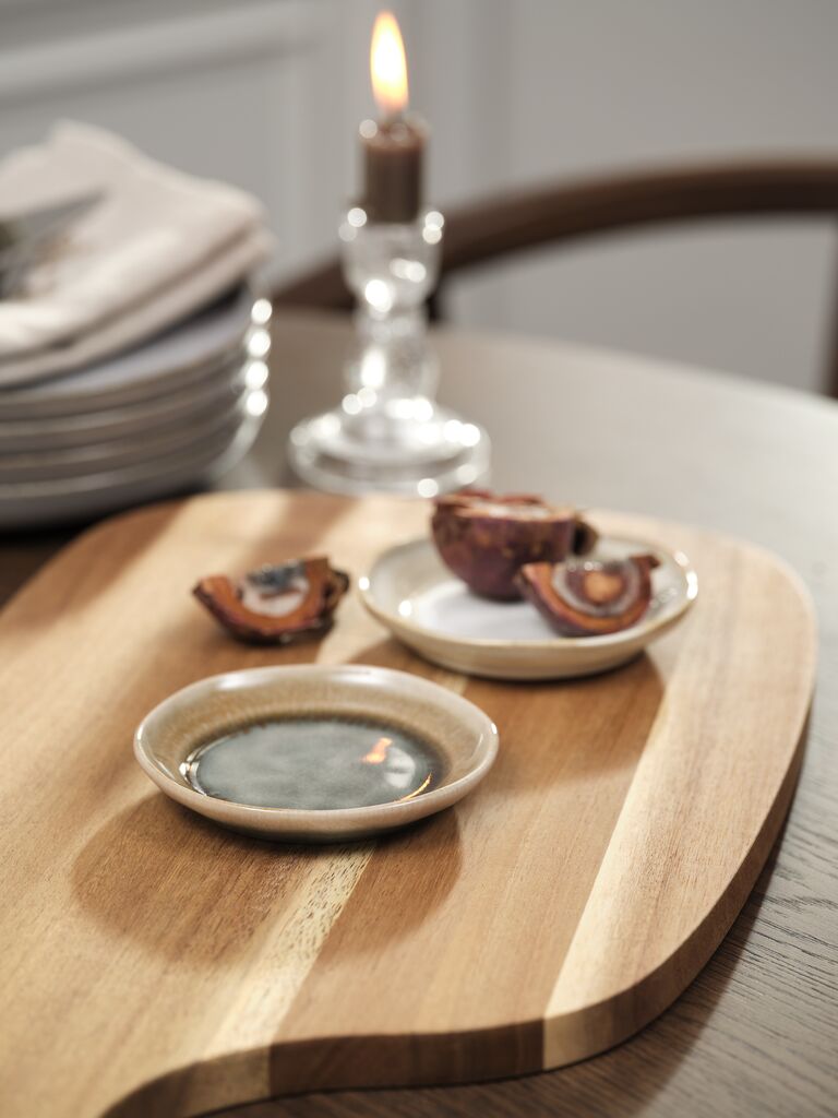 Plate in earthenware with a glaze that gives each piece a unique finish. The small, organic shape is ideal for snacks or as a decorative holder for small items. Dishwasher safe. Sold individually in assorted colours. D10 x H2 cm