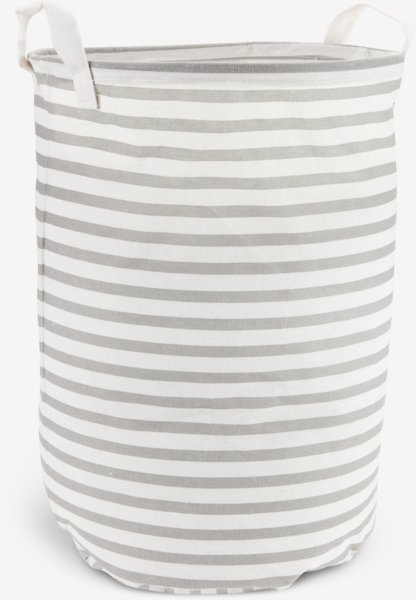 Laundry basket with grey and white stripes and handles. Made from a practical blend of polyester and polypropylene. D36 x H50 cm