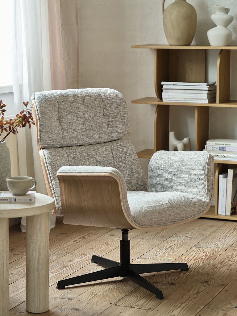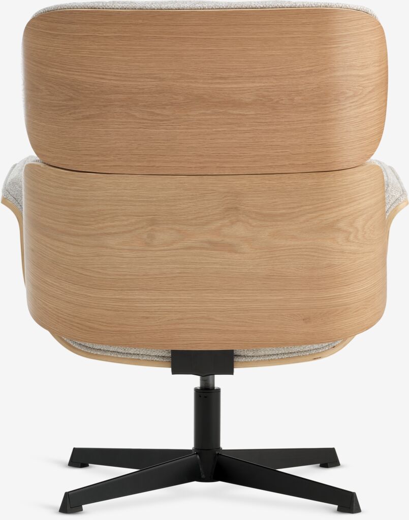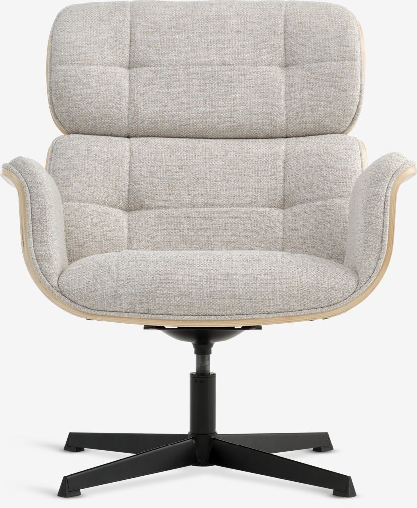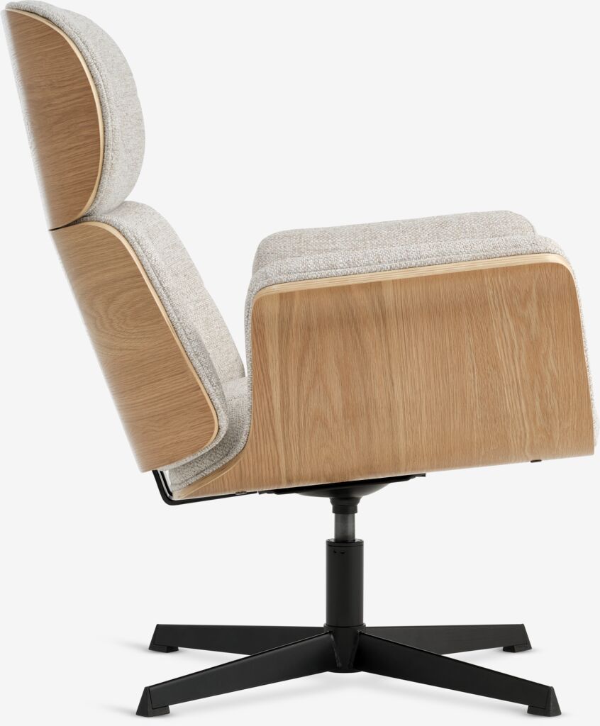 Fabric and oak veneer. Seat and back cushions in foam. With swivel base and stepless tilt mechanism. W74 x H89 x D79 cm