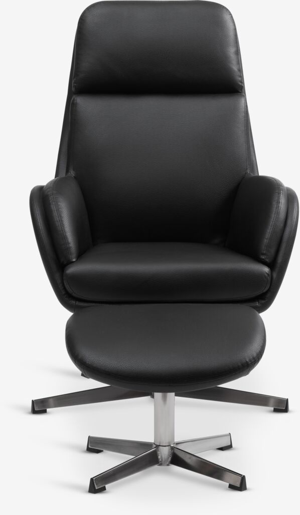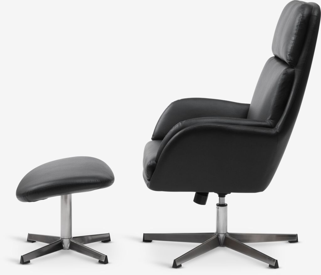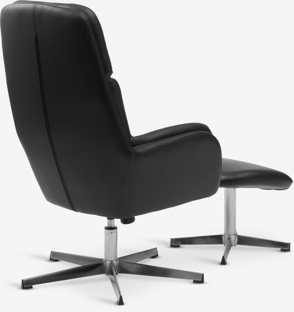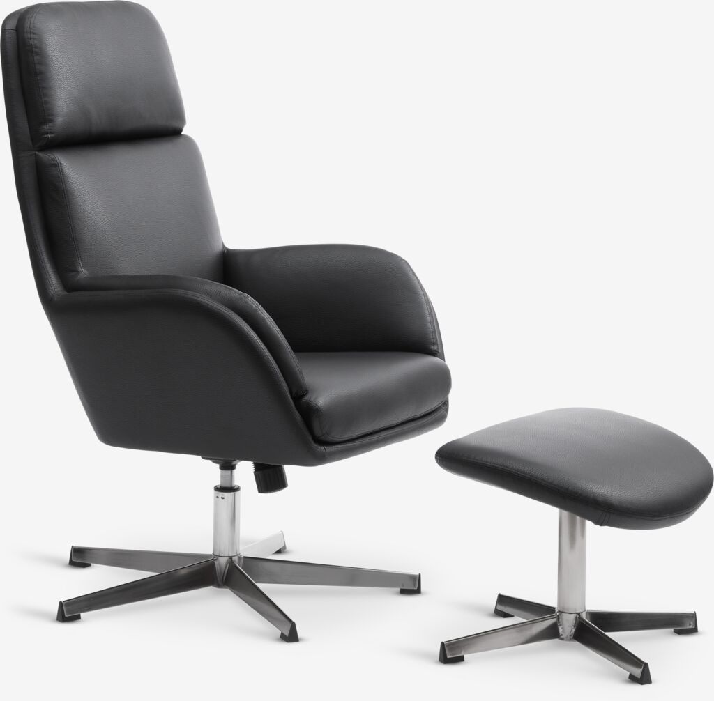 Faux leather. Seat and back cushions in foam. With swivel base in chrome and stepless tilt mechanism. Incl. footstool. W70 x H107 x D119 cm.