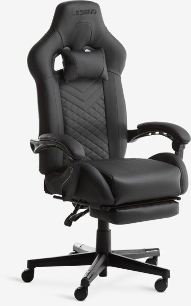 HALLUM gaming chair from LEGEND lets you experience great comfort, so you can sit back and focus on your game. The built-in leg rest is ideal for relaxation, while the neck cushion helps ease strain on your neck. The seat is covered in black faux leather with stitching details in a graphic pattern. W64 x H116-126 x D70 cm