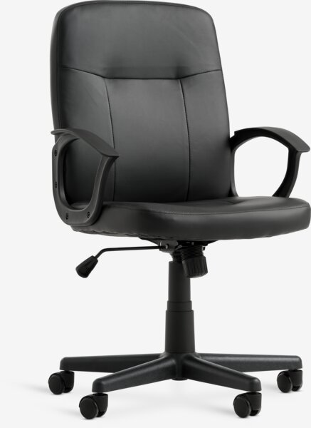 NIMTOFTE office chair gives you good support so you can focus better. An office chair is an adjustable, supportive chair that helps keep you comfortable during long work hours. With armrests, this chair supports good posture so you can sit comfortably for hours, ideal use as a computer chair. The chair is covered in black faux leather. W57 x H92-102 x D64 cm