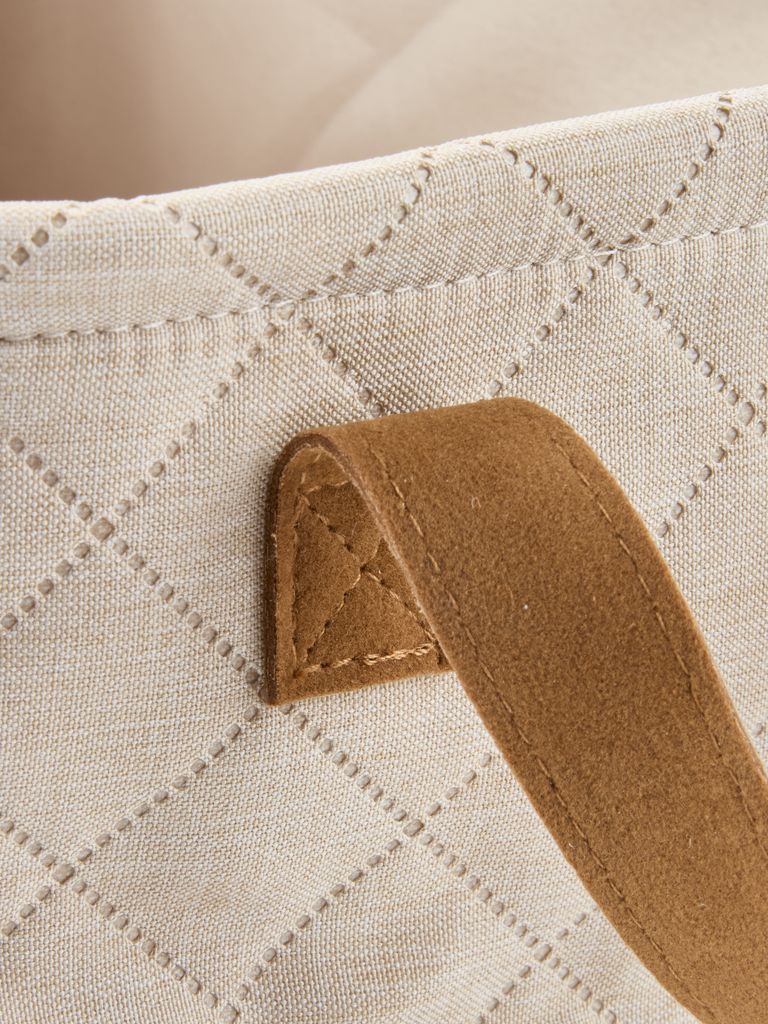 Basket with a beige tone and quilted design, suitable for organising various items, for example gloves, hats and scarves in the hallway. With practical handles in brown faux leather. W23 x L33 x H18 cm