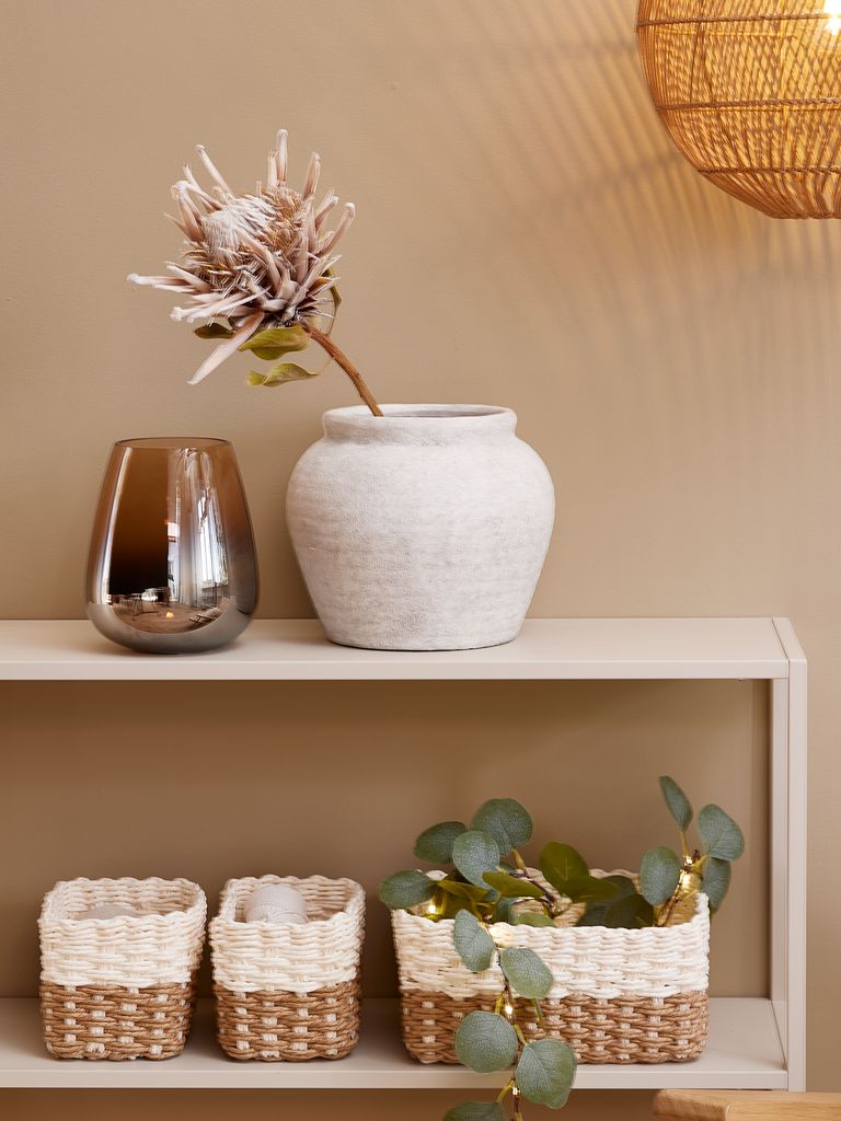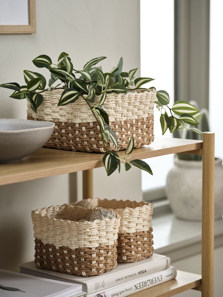 Basket set in natural brown and cream with a woven design, combining style with practical storage. Ideal for organising small items in the bathroom or bedroom. The set includes two small baskets and one medium sized basket. W19/12 x L26/18 x H12 cm