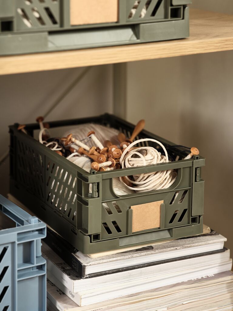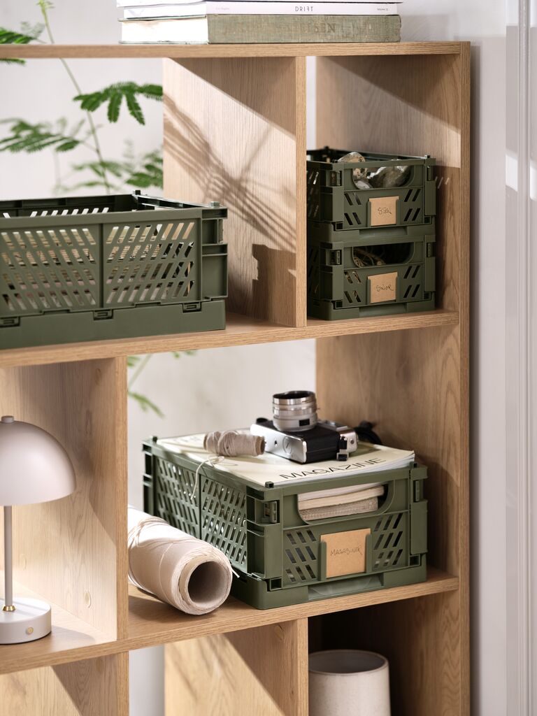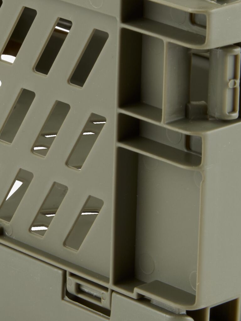 Foldable basket made of plastic (100% recycled) in an olive green colour and a stylish design that fits into any home. Ideal for storing everything from office supplies and hobby items to accessories and small items in the bathroom. The basket is stackable, providing a smart and space-optimising solution. W16 x L25 x H10 cm