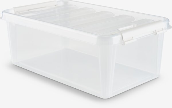 Storage box with lid designed for versatile storage and organisation in the home. Made of durable, transparent plastic that makes it easy to see the contents. The box is stackable, and clip-handles keeps the lid in place. Can hold 4 litres. W19 x L30 x H11 cm